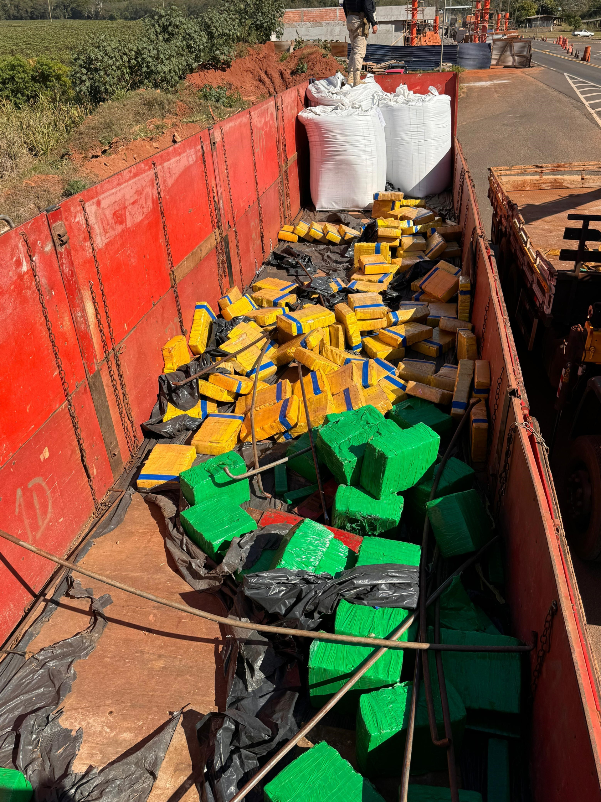 O condutor foi abordado na unidade PRF que se encontra em construção, na BR-487 e, ao ter sua carga fiscalizada, a equipe policial localizou nas laterais e em meio aos bags, diversos fardos contendo tabletes da droga.