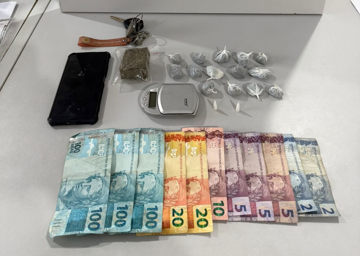 O condutor, um homem de 25 anos, e o passageiro, de 16 anos, foram identificados. Durante uma busca pessoal, foram encontrados três invólucros de substância analógica à maconha e dinheiro no bolso do motorista. No veículo, foram localizados mais 11 invólucros de maconha, dois pinos de cocaína, uma fração de tabletes de maconha e uma balança digital.